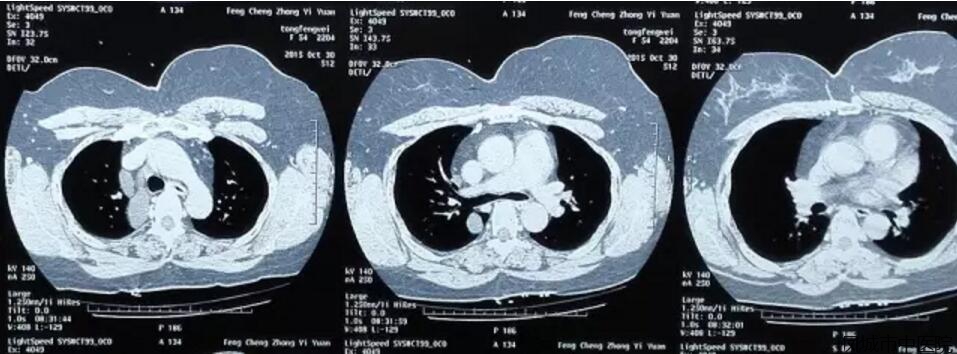 该患者自觉胸闷不适多年,近期有刺激性干咳,术前检查发现右侧胸腔囊性肿物约5X4X3cm大小。